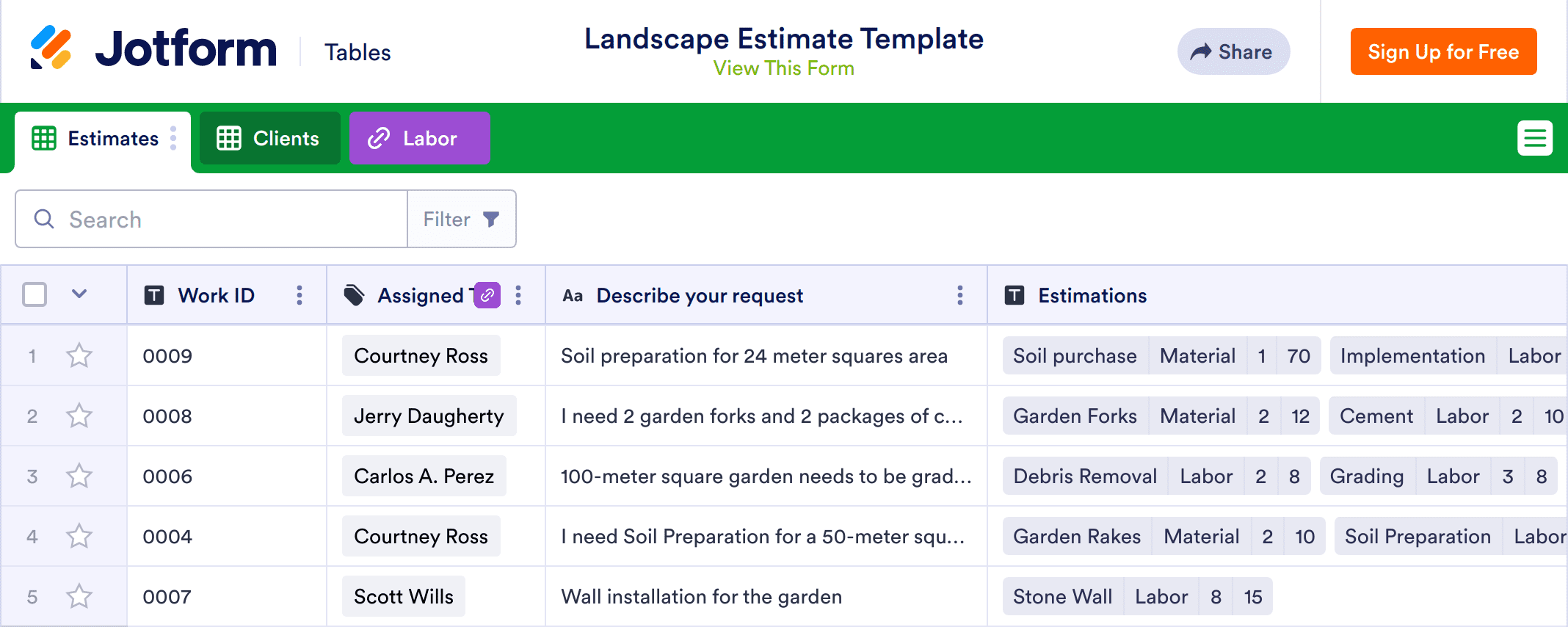 A landscaping estimate template is used by landscapers to detail the costs associated with certain landscaping projects. Whether you’re an independent landscaper or manage a lawn care business, use our free Landscaping Estimate Template to quickly and easily determine cost estimates for each new landscaping project. Simply enter details such as work ID number, project descriptions, assigned landscaper, unit cost, and hours required into the spreadsheet provided. And with our Form Builder, you can even sync this sheet to an estimate request form that instantly populates the spreadsheet with submission data.