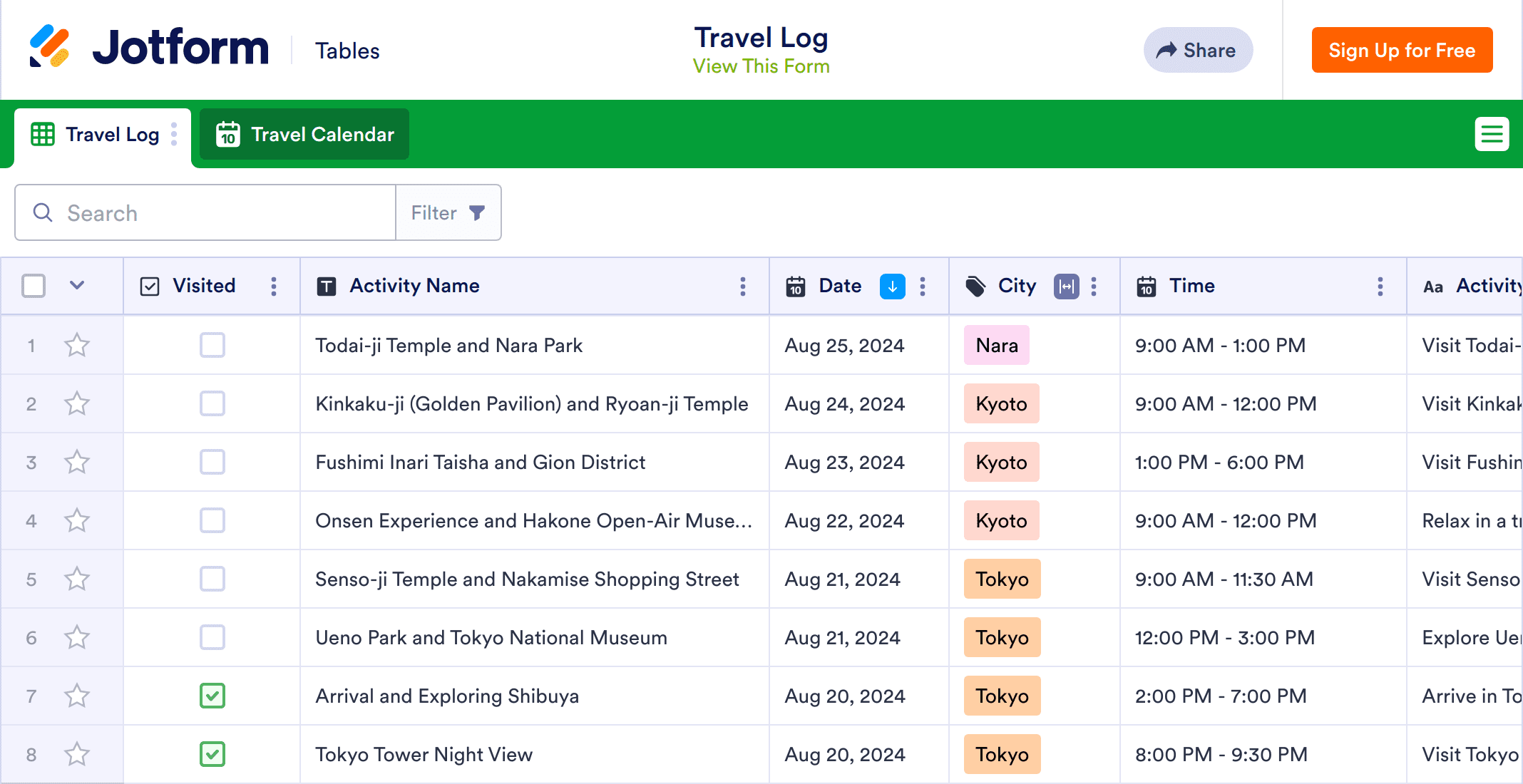 A travel log is used to track travel dates, times, and locations. With this free Travel Log Template from Jotform, you can expertly track and manage travel details in a powerful online spreadsheet. Simply customize the spreadsheet however you like, then fill it out directly or enter travel details into the attached form to auto-populate the table.