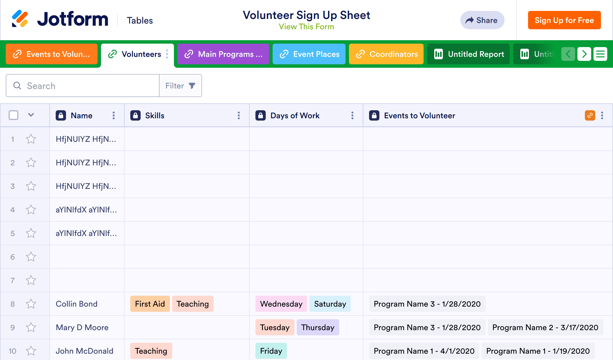 A volunteer signup sheet is used by charities or nonprofits to manage volunteer details online. With Jotform’s free online Volunteer Sign Up Sheet, your charitable organization can easily manage volunteer applications, contact info, event details, hours of work, and more. Get started by customizing this template and filling it out manually, or connect it to an online form to auto-populate the table. If you’d like to see which days of the month your volunteers are working, simply switch from spreadsheet to calendar view to easily see shift details on any device.