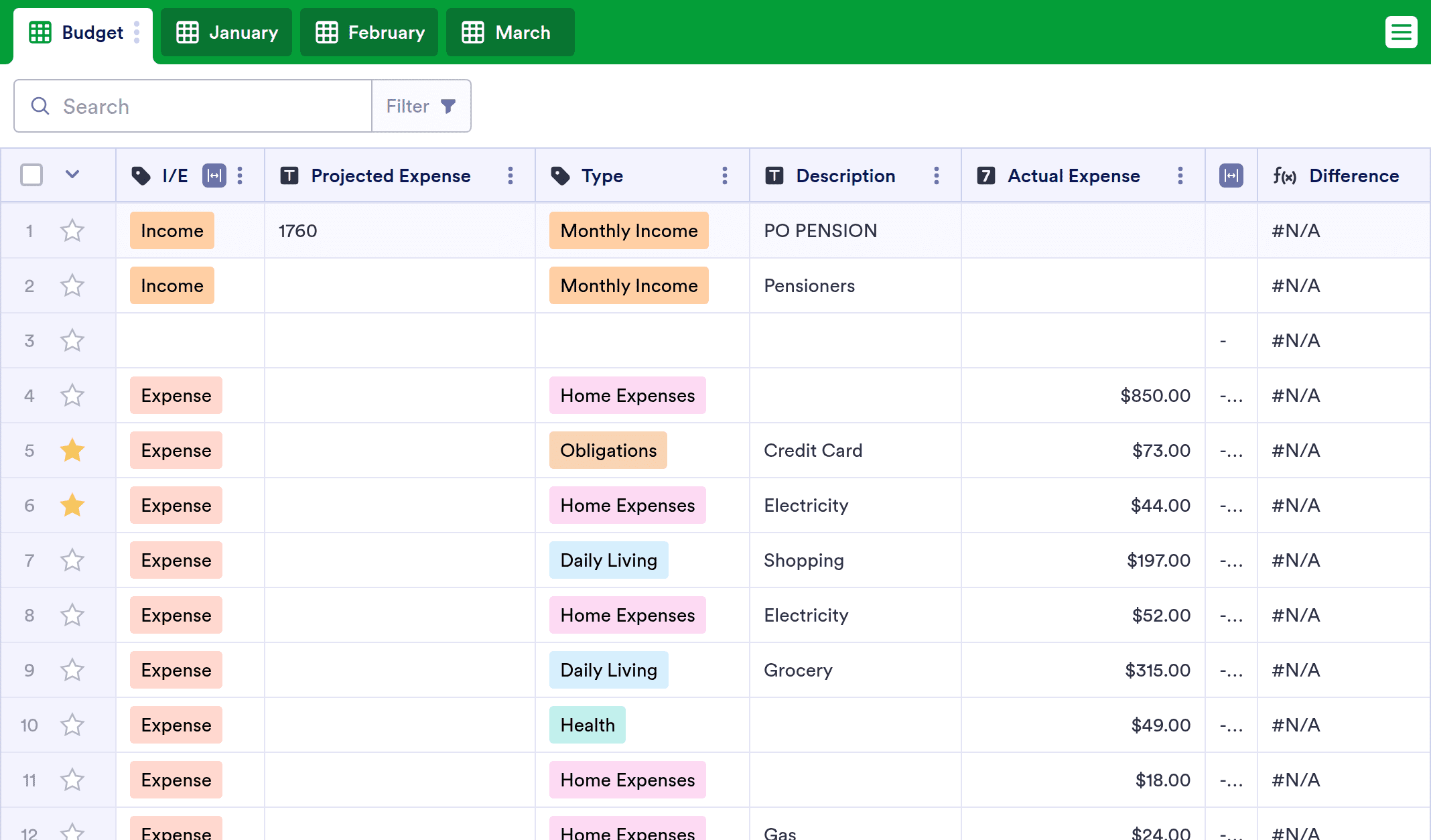 In just a few clicks you can customize this Monthly Budget Template to perfectly match your needs. Add tabs to organize info by month, change label names and colors, and automatically calculate totals with our quick calculation feature. You can even switch between spreadsheet, card, and calendar view to choose how to see your information! With a custom Monthly Budget Template helping you track your expenses on any device, you can keep better track of your spending and stay on budget.