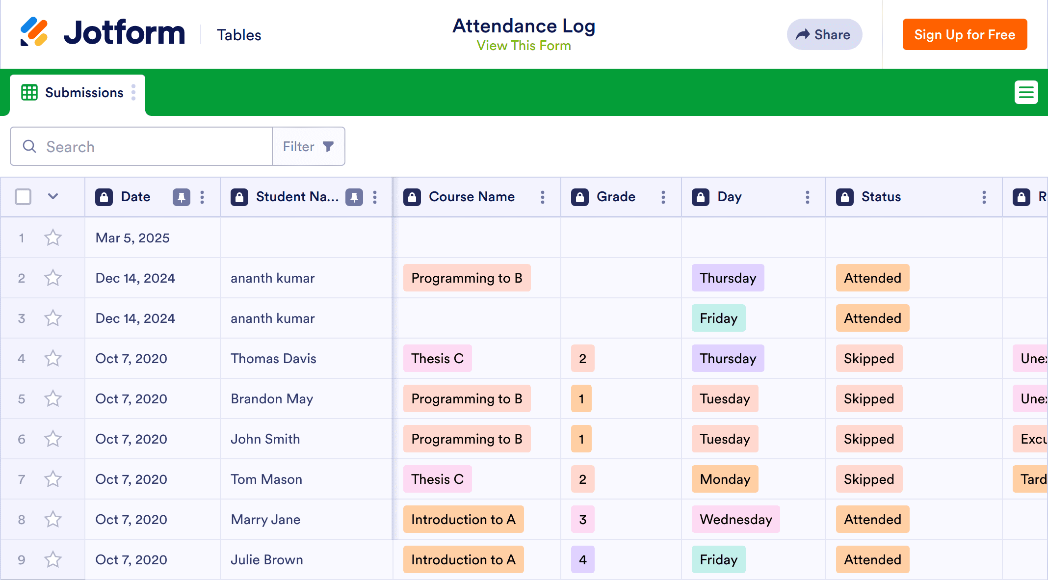Without any coding, you can easily track attendance for your students. Customize your online Attendance Log table and attached form to match your needs. Add more columns and include extra tabs with just a few clicks to monitor your student's attendance for different days and classes. You can even filter your online table with student names, dates, and attendance status. Track your attendance easier than ever before with Jotform’s free Attendance Log!