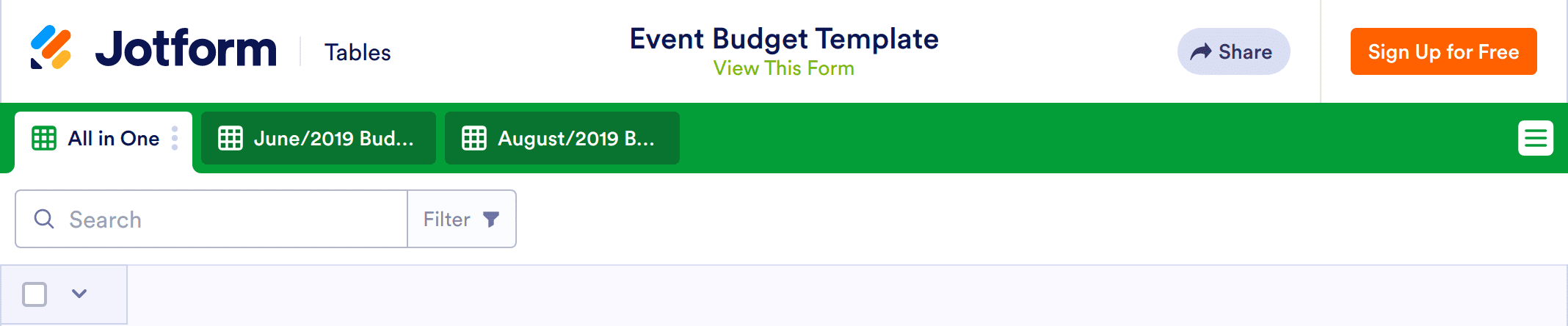 Make sure your next event goes off without a hitch with this free online Event Budget Template! With Jotform Tables’ all-in-one spreadsheet-database hybrid, you can expertly track your expenses and ensure your event doesn’t go over budget. Get started by entering your budget information into the attached online form, uploading a CSV or Excel file to import your existing budget data, or adding expenses by hand. You can then share your table to collaborate with your team in a powerful all-in-one workspace, or download your data to store it offline!