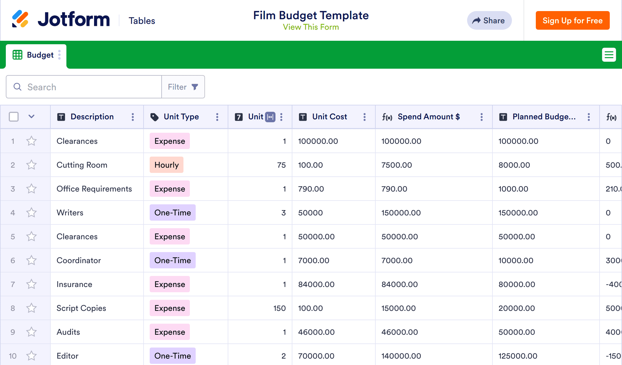 You’re dedicated to creating a film like never before, with an original storyline and unique directing — so why not do the same with your Film Budget Template? Just drag and drop to add more rows and columns, color-coded labels, tabs for additional production details, and filters to group and organize expenses more easily. When you’re done, you’ll have a custom, easily-accessible Film Budget Template that’s ready for its closeup!