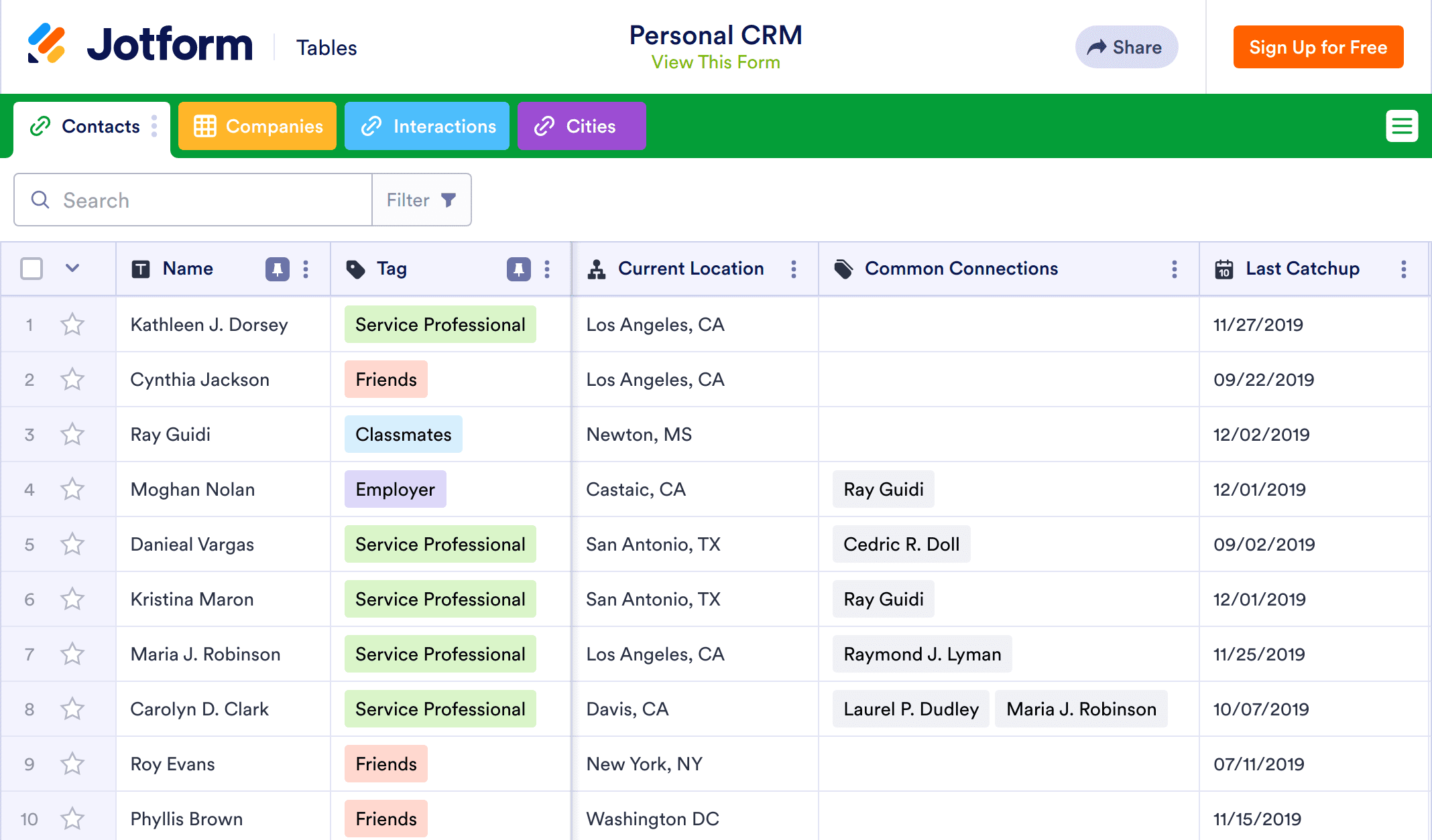 A personal CRM is a relationship management system used by an individual rather than by a team. Whether you want to manage your professional or personal relationships, our Personal CRM Template makes it easier to keep track of contacts and connections. To get started, simply enter information about coworkers, colleagues, friends, family, and anyone else you’d like to keep in your life. You can even add color-coded labels, include contact details, and describe interactions. When you’re done, you’ll be able to access and edit your Personal CRM on any device.