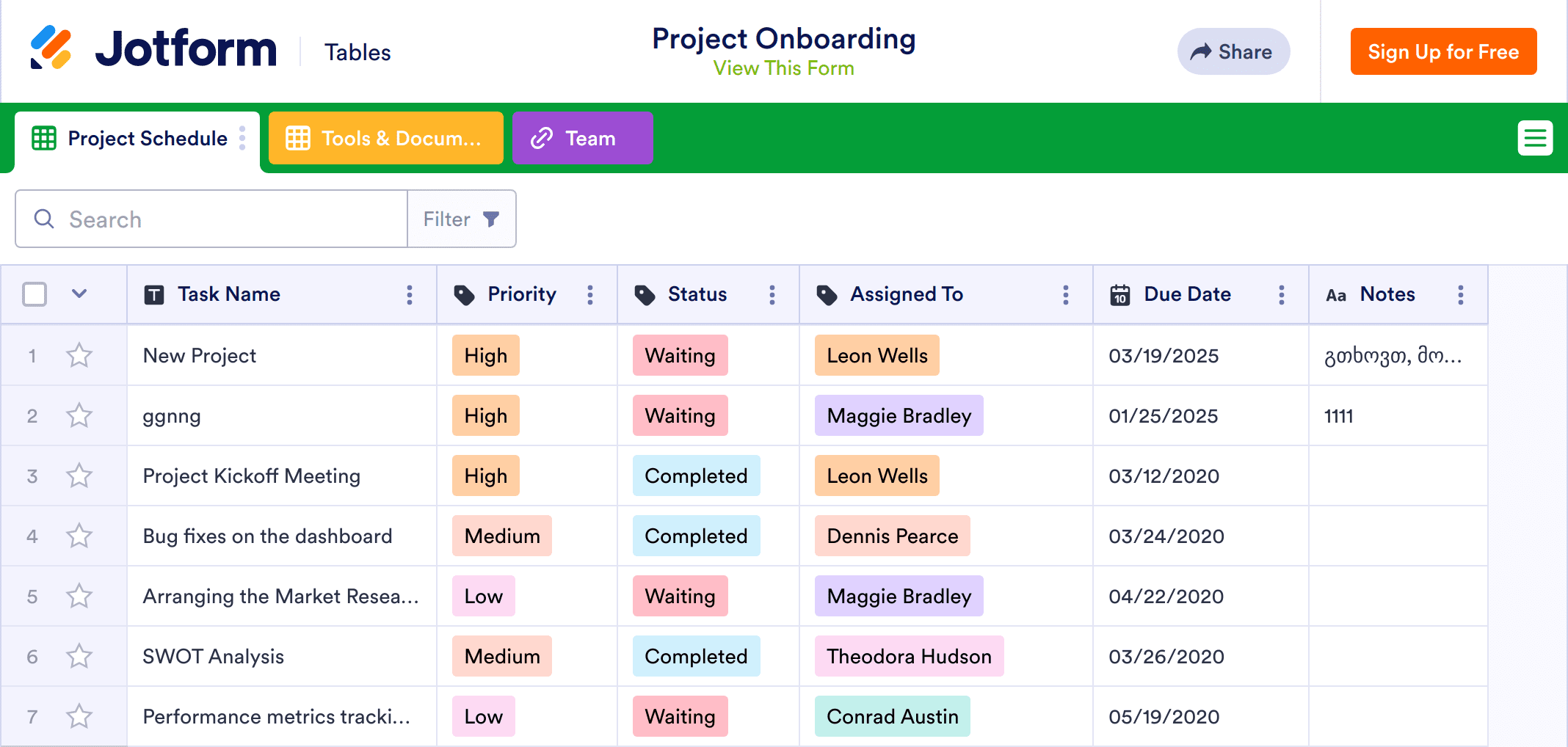 Start your new projects off on the right foot with Jotform’s free Project Onboarding spreadsheet! By filling out the attached project task assignment form on any device, you can automatically send new task and project information straight to your professional online Jotform account, protected with 256-bit SSL connection, GDPR compliance, and CCPA compliance. Keep track of each task’s name, status, priority, due date, and who it’s assigned to — you can even share your spreadsheet with teammates for better collaboration!