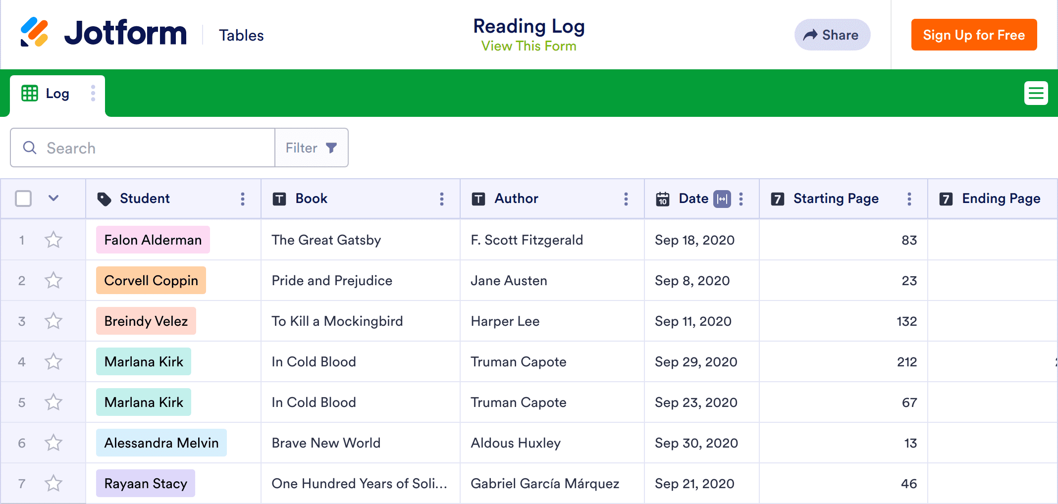 Having your students read every day is a great way to strengthen their comprehension skills and academic performance overall. No matter what grade level you teach, track student progress with this free online Reading Log. Students can fill out the attached form at home by recording what book they’re reading and how many pages they’ve read that night, confirmed by their parents’ electronic signature. You’ll instantly receive responses in your Reading Log Sheet, easy to view from any computer or mobile device, download as a PDF, CSV, or Excel file, or print for your student records.