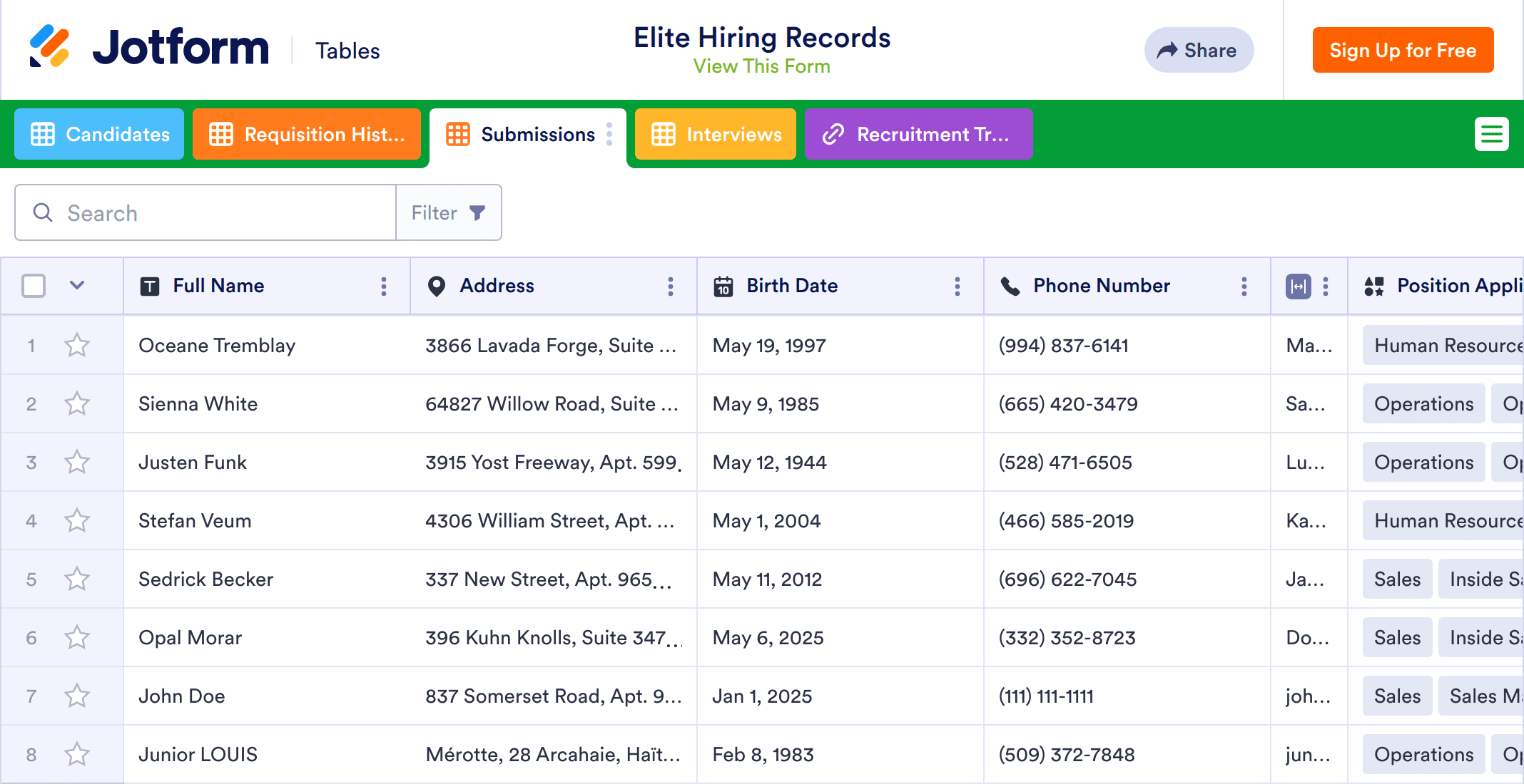 A recruitment tracker is used to track job applications, interviews, and candidate contact details online. Improve your recruitment process with this free Recruitment Tracker table! Just enter candidate info by hand, or link your online job application form with your Recruitment Tracker to add new candidates automatically! By adding interview notes to existing candidates, you can compare strengths and weaknesses to choose the right person for the job.