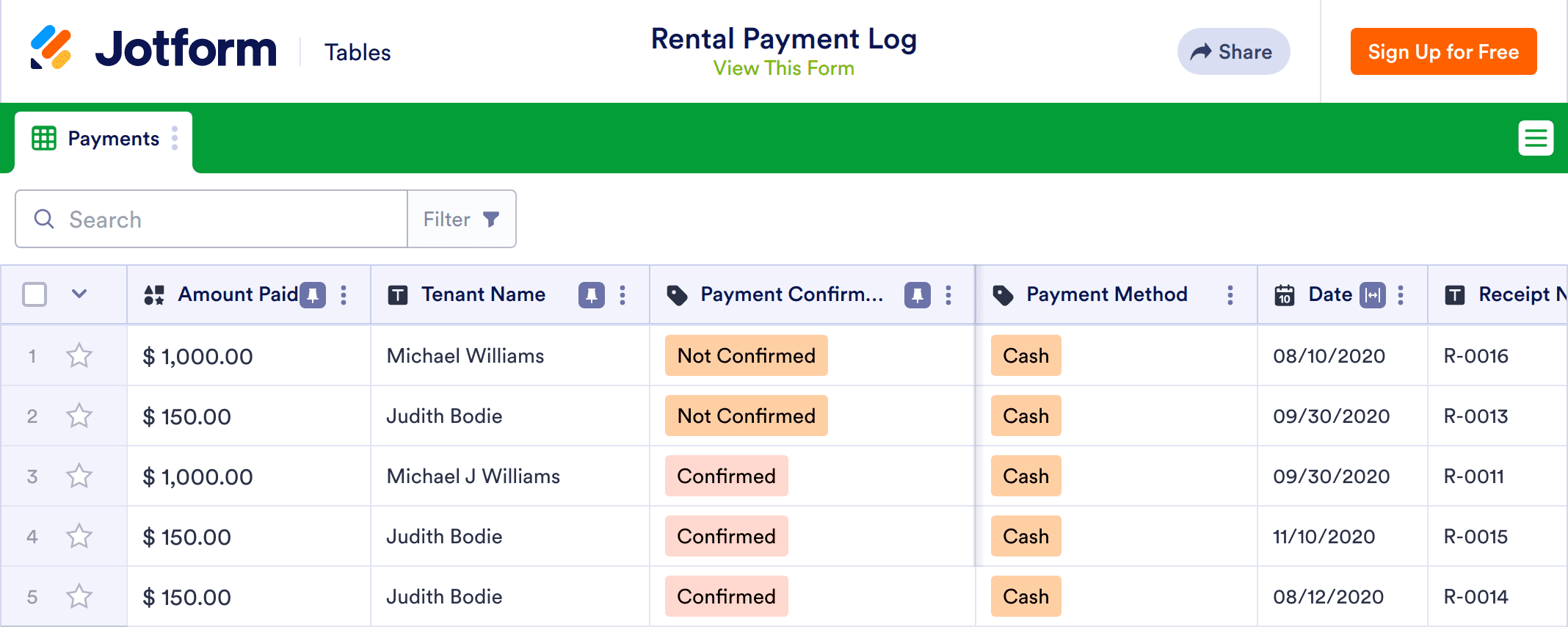 A rental payment log is a ledger that keeps track of tenants’ rent payments. Whether you’re a landlord, property manager, or property owner, expertly manage rent payment information and tenant contact details in a professional online database with Jotform’s free Rental Payment Log Template. Simply enter your rent payment information manually, upload existing data as a CSV or Excel file, or use an online form to simultaneously accept rent payments online and update your table automatically!