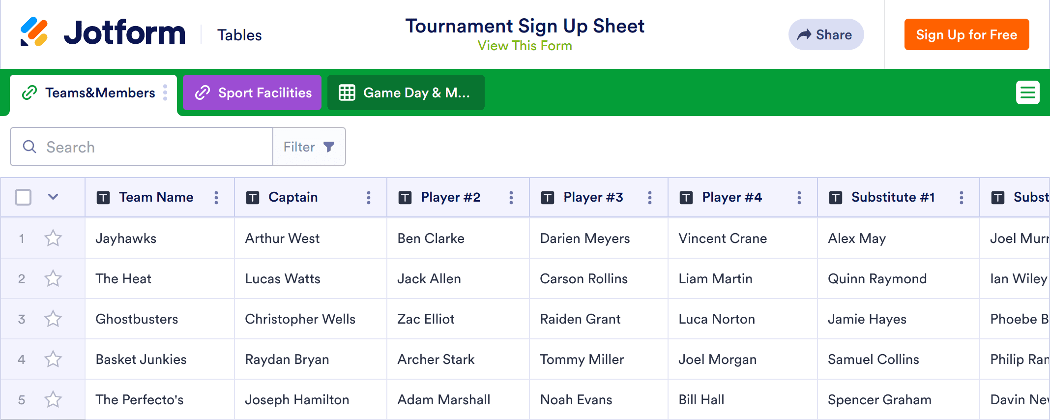 Let the games begin! Whether you’re hosting a local tournament for traditional sports, e-sports, board games, or card games, use Jotform’s free online Tournament Signup Sheet to keep track of players, matches, facilities, and more. To get started, create a tournament signup form with our drag-and-drop Form Builder and embed it in your website to start registering new players — each submission containing team names and logos, captains and players, and contact information will automatically appear in the Tournament Signup Sheet!