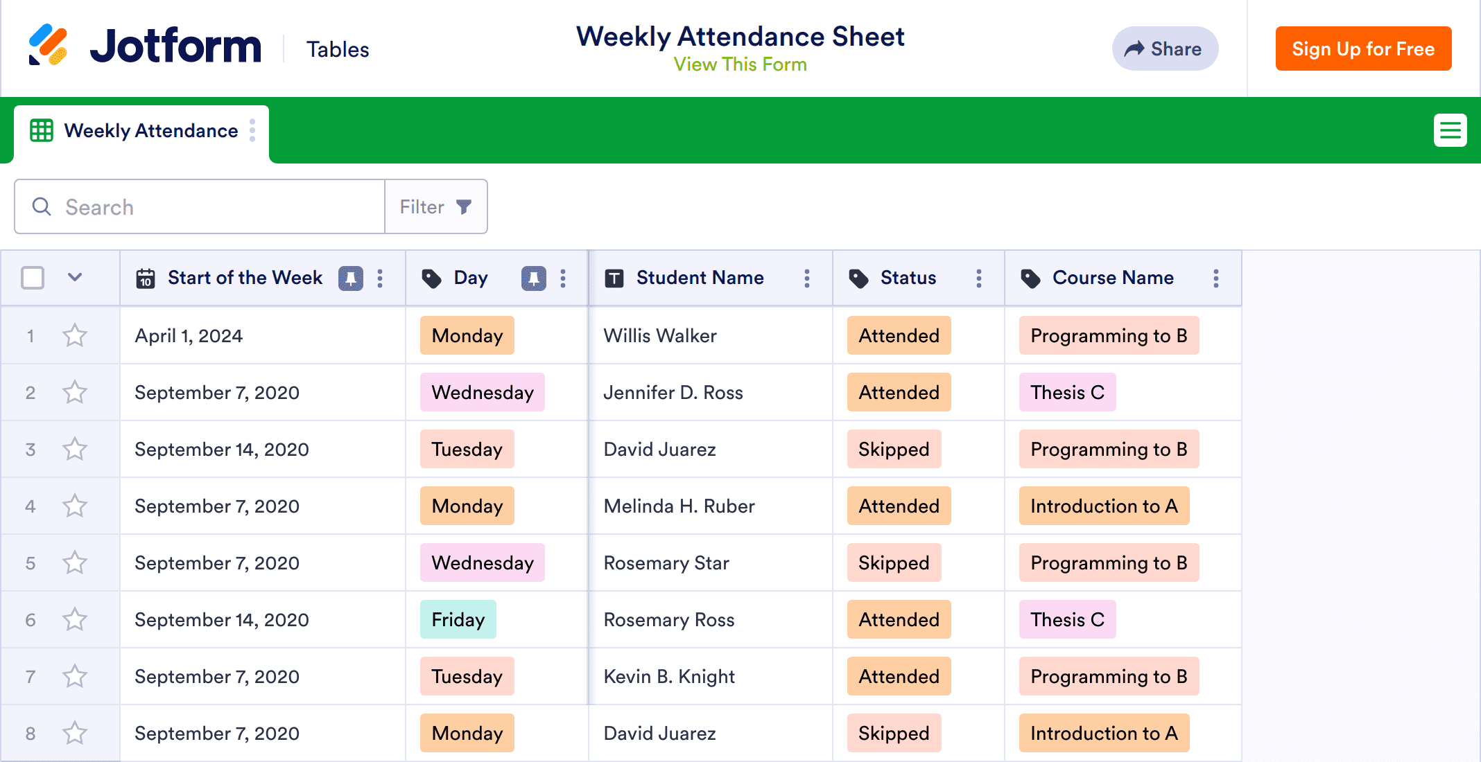 Customize this spreadsheet template in just a couple of clicks with Jotform’s user-friendly interface. Choose new label names and colors, add extra tabs or rows, or rearrange the layout for a whole new look. By keeping track of student, employee, or volunteer attendance in a free online Weekly Attendance Sheet, you can better monitor attendance to identify problem areas and better manage your school, company, or nonprofit.
