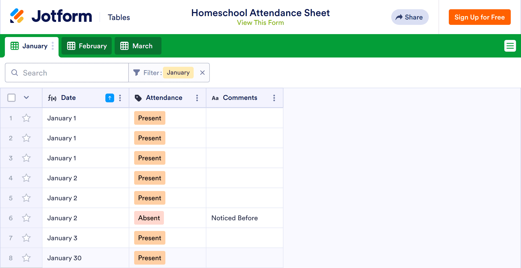 Keep track of monthly attendance in a free online spreadsheet or calendar. Ideal for teachers, charities, and businesses. Quickly customize, download, and share.