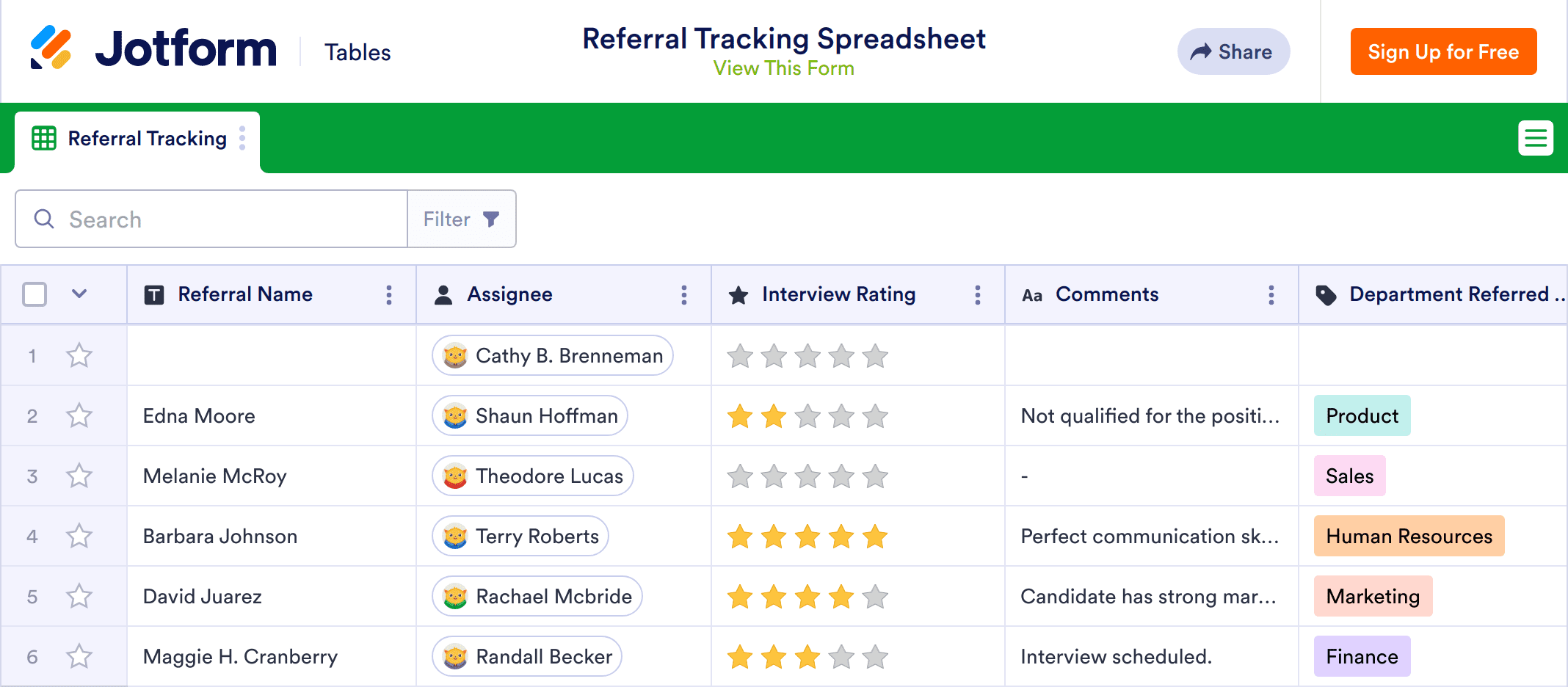 Get the look and function you need by customizing this Referral Tracking Spreadsheet with no coding required. Add new columns, split info into separate tabs, add questions to the attached form, personalize color-coded tags, and more. Information can be viewed as a table, calendar, or as easy-to-view cards that help you view each candidate’s information separately. Take your employee referral process to the next level with Jotform’s free Referral Tracking Spreadsheet.