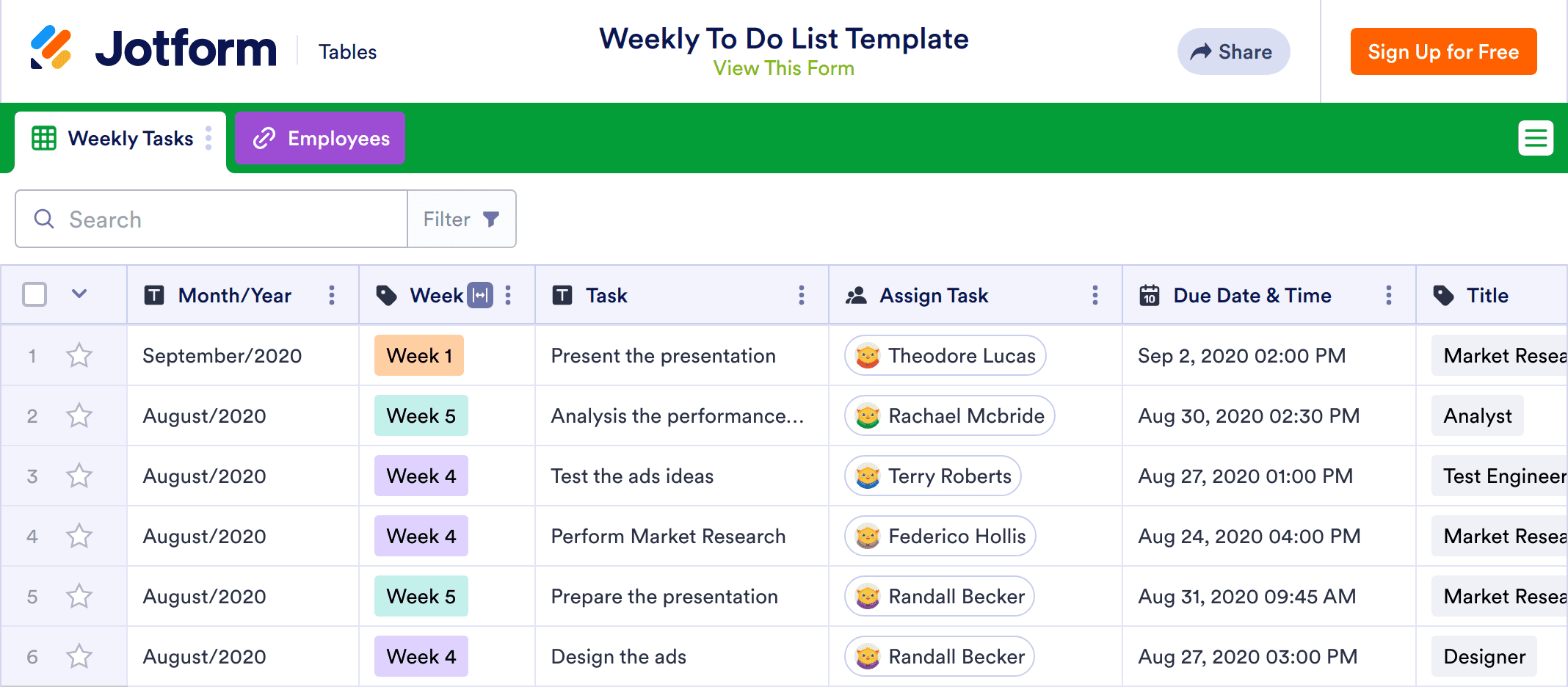 No matter what type of business you run, track weekly employee tasks with our free online Weekly To-Do List Template. All you have to do is enter information about each weekly task, assign it to an employee or teammate, and check off when it’s been completed. You can even assign forms for people to fill out once they’ve completed their weekly tasks, automatically updating the spreadsheet for you! You’ll be able to view your Weekly To-Do List Template from any device, and you can easily download, print, or share it in one click.