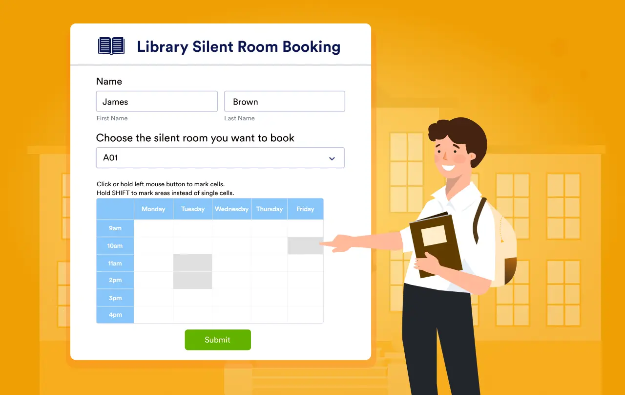 With our free MultiSelect Grid widget, you can let users select dates and times, seating options, symptoms, and more from a clickable grid. Selected slots of the previous users will become unavailable for the later users, so that they cannot select the same slot. Simply add the widget to your form, label the rows and columns, and you’re good to go!